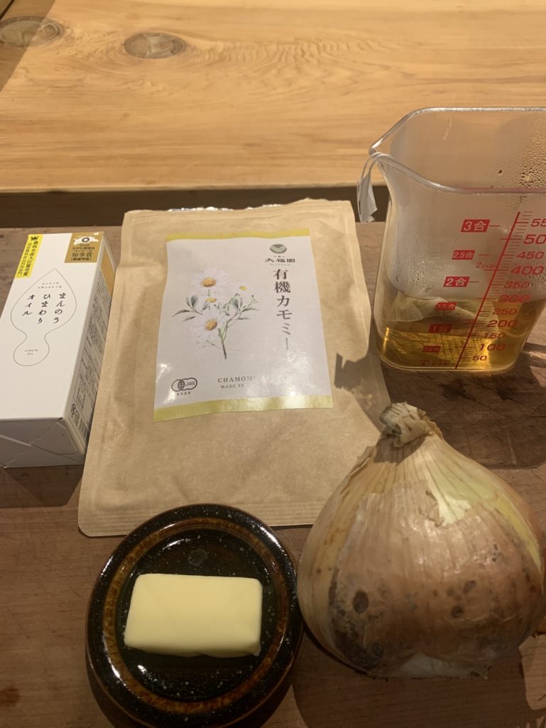 新玉葱の甘みと、お茶の大福園のカモミールティーのやさしい香りが絶妙にマッチしたポタージュスープをご紹介します。