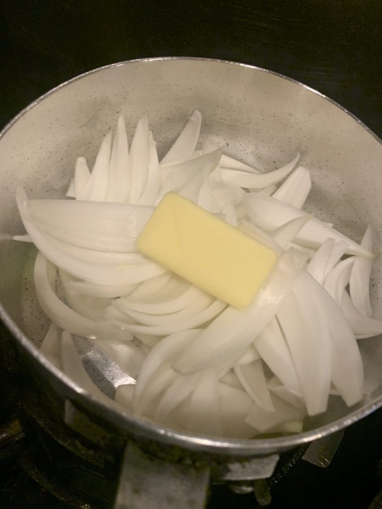 新玉葱をざく切りにして鍋に入れ、バターでじっくり炒めます。